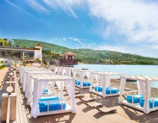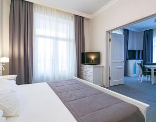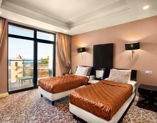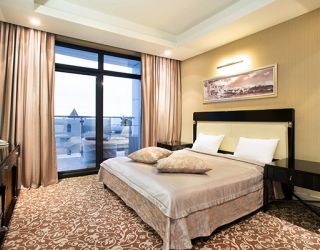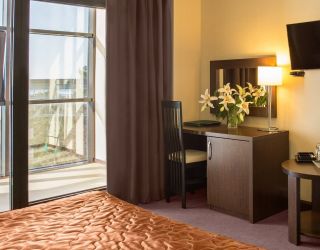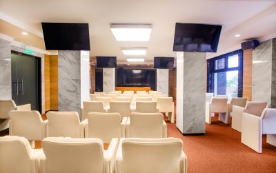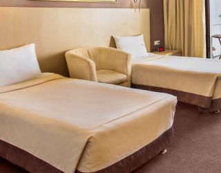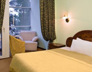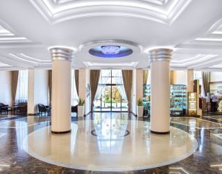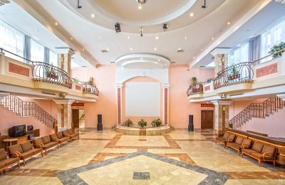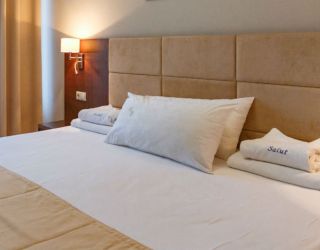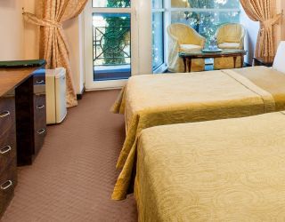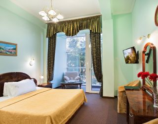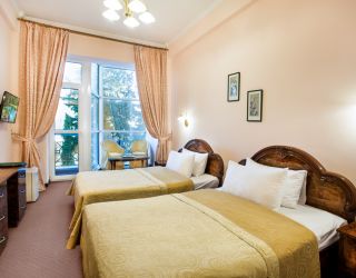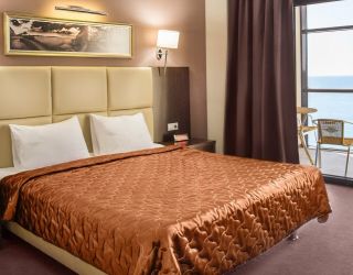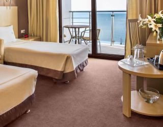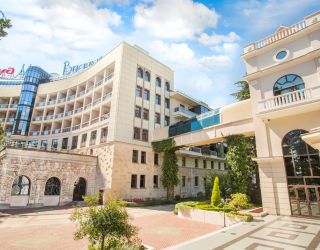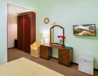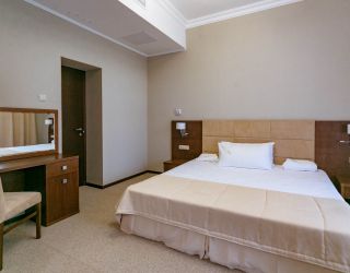 Отдохнуть приятно в комфортных кондиционированных номерах. Приехать можно с детьми: с 2-летнего возраста, с 4-летнего – с путевкой на лечение. Для родительского комфорта есть помощники: детские аниматоры, воспитатель и няня. Дети будут присмотрены и заняты: на детской площадке, в бассейне для маленьких, в игровой комнате или на водных аттракционах с горкой.