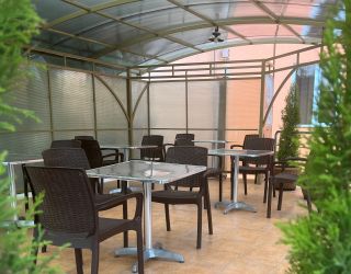 Для приготовления еды есть общая кухня с необходимой бытовой техникой, посудой и столовыми принадлежностями. На свежем воздухе обустроена терраса для отдыха. Для личного транспорта постояльцев предусмотрена парковка. Ближайший пляж галечный, оборудован шезлонгами, зонтами от солнца, навесами и раздевалками. Для отдыхающих предоставляется широкий выбор развлечений на любой вкус.