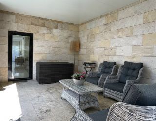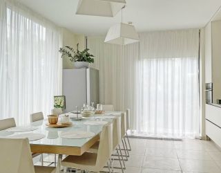 Внутри виллы есть кухня-столовая с большим обеденным столом на 8 персон, гостиная с большим модульным диваном, телевизором и аудиосистемой с караоке.
