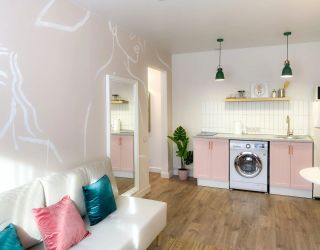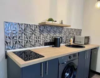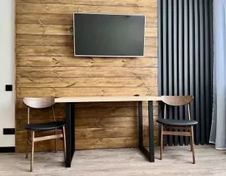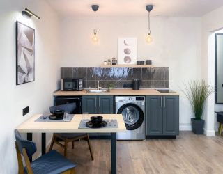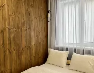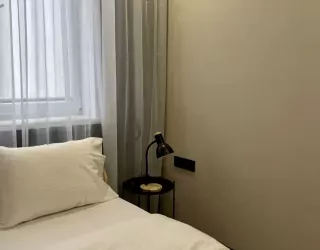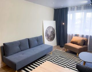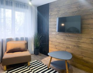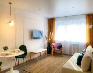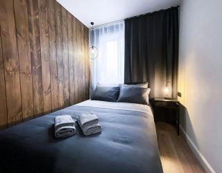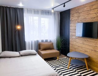 Апартаменты находятся в 5-этажном жилом доме. Интерьер оформлен в современном стиле, выполнен дизайнерский ремонт. Установлена удобная мебель для отдыха и хранения одежды, есть телевизор с плоским экраном, сплит-система, гладильные принадлежности, стиральная машина. Санузел оснащен душевой кабиной, предоставляются туалетные принадлежности.