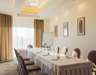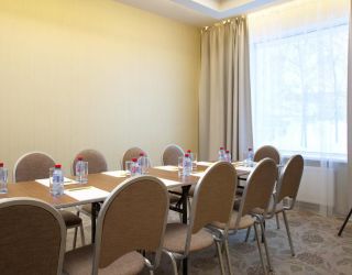 Переговорная ЭЛЬБРУС на втором этаже отеля. Площадь 31 м2, вместимость до 30 гостей рассадкой «Театр», до 15 гостей вокруг большого стола. Кофе-паузы накрываются в самой переговорной, либо в находящейся рядом лаунж-зоне. Презентационное и звуковое оборудование, блокноты и ручки предоставляются. Зал оснащен системой кондиционирования и приточки свежего воздуха.