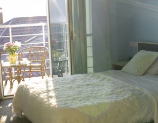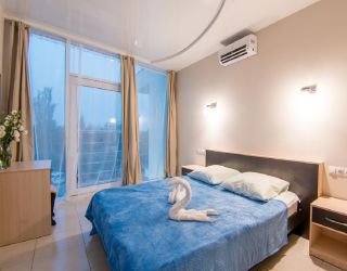 Стильное и современное бело-голубое здание отеля было построено в 2016 году. В отеле могут разместиться около 100 отдыхающих — им предлагаются на выбор номера различных категорий, от светлых просторных стандартов до двухкомнатных люксов с оборудованной мини-кухней. Из окон большинства номеров открываются впечатляющие виды на море, горные вершины и живописные окрестности, часть номеров имеет балконы или отдельные террасы. Номера кондиционируются и оснащены всем необходимым, для комфортного пребывания — от сейфа и TV до фена, на всей территории доступен wi-fi. Детей можно разместить на дополнительных местах — диванах или раскладных кроватях. Лифтом корпус не оснащен.