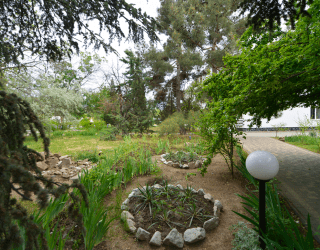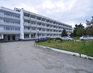 Поездом до ж/д вокзала г. Феодосия, далее пройти 600 м до остановки «Магазин Электротовары», далее на рейсовом автобусе №107 до остановки «Турбаза», далее 640 м до пансионата.