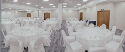 Зал оформлен в бело-серых тонах, что отлично подходит для проведения конференций или банкетов с световым шоу.