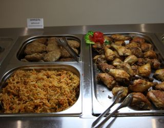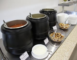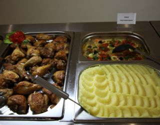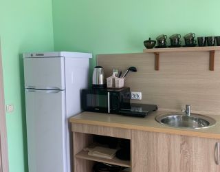 На территории базы также есть столовая, кухня общего пользования, зона барбекю и парковка для автомобиля. Питание не входит в стоимость путевки, но за дополнительную плату можно заказать Шведский стол. Также рядом с базой отдыха можно найти множество кафе, ресторанов, столовых. Магазины и местный рынок находятся в шаговой доступности.