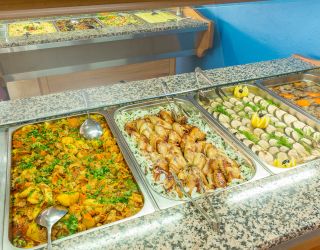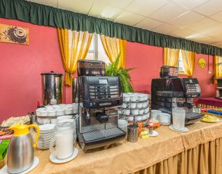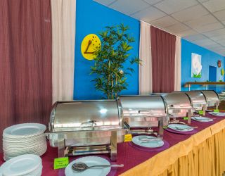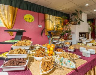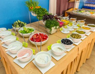Питание гостей отеля осуществляется только в завтрак по системе «шведский стол» в основной столовой, кроме которой есть еще кафе на первом этаже.