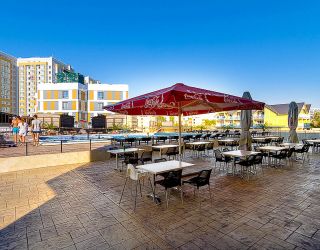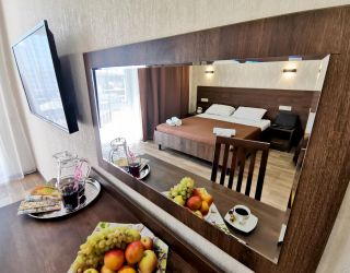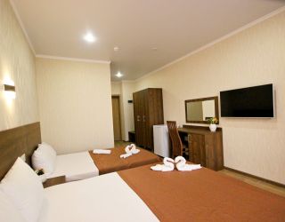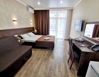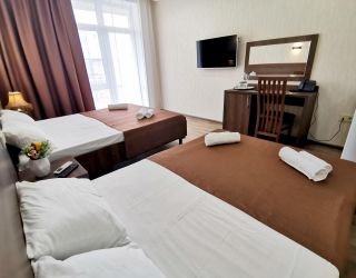 Современное 7-ми этажное здание гостевого дома, оснащенное лифтом, возвышается почти прямо на пляже. Гости могут выбрать комфортабельные просторные номера с удобствами. В комнатах установлена сплит-система, есть индивидуальный санузел с душем, плазменный телевизор и другая бытовая техника.