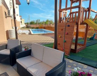 До песчаного побережья 10—15 минут ходьбы, на пляже установлены кабинки для переодевания, есть лежаки и навесы от солнца.