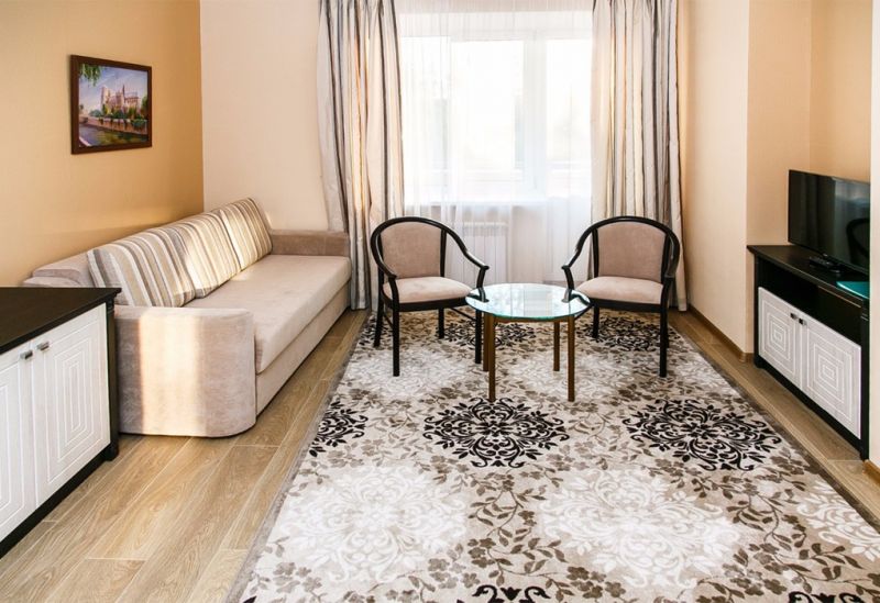 На благоустроенной территории площадью более 37 гектаров расположились пять многоэтажных жилых корпусов, рассчитанных на единовременное заселение трехсот тридцати человек. Гостей ожидают двух- и четырехместные номера категории Стандарт, Семейный, Улучшенный и вместительные Апартаменты. Номера с душем или ванной укомплектованы необходимой бытовой техникой и удобным мебельным гарнитуром, в апартаментах встроена оборудованная мини-кухня.