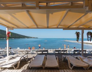 Санаторий имеет свой пляж с мелкой галькой, площадью 3300 м.кв., с прокатом пляжного и спортивного инвентаря, душем, двумя аэрариями, водными велосипедами, медицинским пунктом, находится в 50 метрах от санатория.