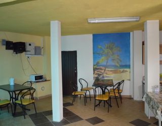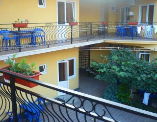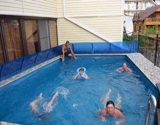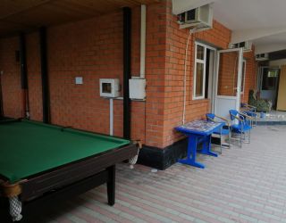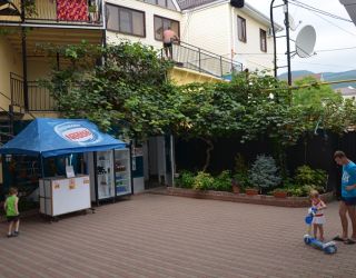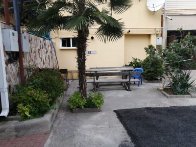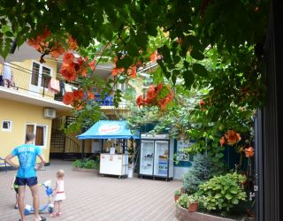 Во дворе гостевого дома оборудована общая кухня для самостоятельного приготовления еды. Помещение оснащено плитой, холодильником, микроволновой печью, чайником, посудой и столовыми принадлежностями. Также на свежем воздухе есть зона для приготовления шашлыка. Отдыхающие имеют возможность поплавать в открытом бассейне, а также поиграть в бильярд. Расстояние до пляжа составляет 1 км. Береговая линия галечная, с шезлонгами, зонтами и навесами от солнца.