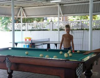 На территории работает кафе-столовая, доступен беспроводной интернет. В распоряжении отдыхающих открытый бассейн, настольный теннис, бильярд. Для автовладельцев предусмотрена парковка, по вечерам в гостевом доме проходят анимационные программы. Юные гости могут поиграть на площадке с горками и качелями, а малышам администрация гостевого дома предоставляет в аренду кроватки и прогулочные коляски.