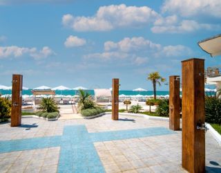 К морю отдыхающие ходят пешком, либо их подвозит курсирующий от санатория микроавтобус. Особенность санаторного побережья – двухполосное разделение на пляжи с песком и галькой.