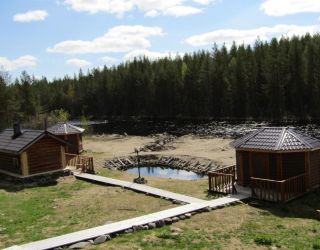 Комплекс занимает небольшую территорию, расположенную в тихом и уединенном уголке Карелии. База отдыха включает в себя два деревянных двухэтажных дома-сруба и два одноэтажных бревенчатых дома. В домах есть все необходимое — санузел с душем или ванной, кухня, бытовая техника, отапливаются помещения печью. Двухэтажных домах предусмотрены балконы и террасы.