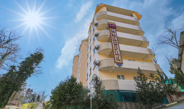 Трехзвездочный отель «Империя» расположился в Сочи на побережье Черного моря всего в двух минутах ходьбы от городского пляжа «Салют». В доступной близости вся инфраструктура района – магазины, кафе, развлекательные центры, в сорока километрах находится международный аэропорт, в семи железнодорожная станция «Сочи».