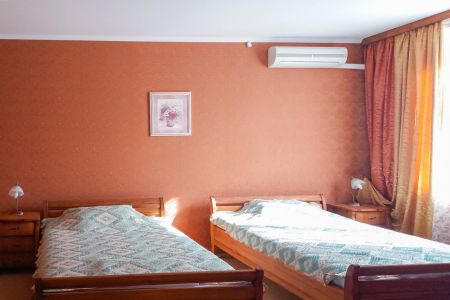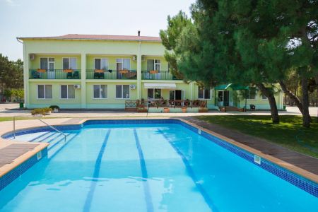 Поездом до ж/д вокзала г. Симферополь, далее на электричке до остановки «Почтовая», далее на маршрутном такси «Симферополь Курортная – Песчаное» до остановки «Песчаное-1», далее на маршрутном такси «Симферополь Курортная – Береговое» до остановки «Центральный пляж», далее пройти пешком 790 м до отеля.