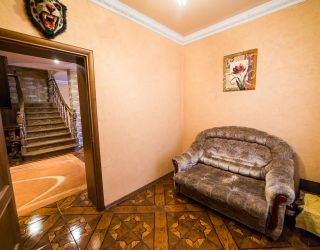 Двухэтажный коттедж предполагает размещение 10 человек. В распоряжении постояльцев две изолированные спальни и уютная кухня-гостиная. В качестве спальных мест предусмотрено две 2-спальных кровати и три 2-спальных дивана, так что гости могут с удобством отдохнуть после активного дня. На просторной кухне представлена необходимая бытовая техника – холодильник, СВЧ-печь, варочная панель, чайник, вытяжка. Имеются столовые приборы и набор посуды для приготовления пищи. Для удобства гостей в коттедже оборудовано три санузла – два из них с ваннами, один – с душевой кабиной. Установлена стиральная машина.