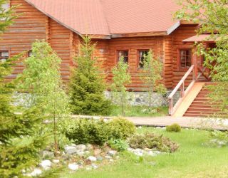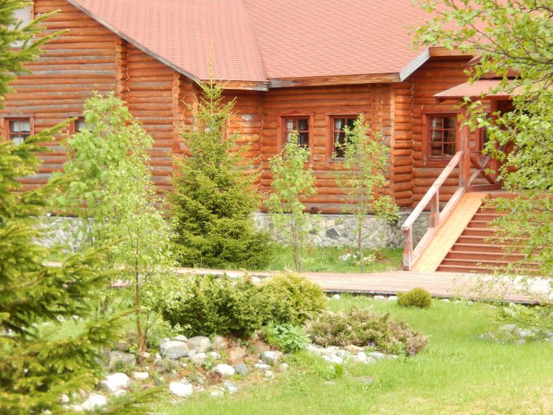 Территория гостиницы представляет собой прекрасный парковый ансамбль, включающий в себя раскидистые ели, цветущие кустарники, клумбы, небольшой пруд, мощёные деревянные дорожки и скамейки для отдыха в тени деревьев.