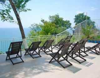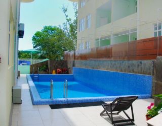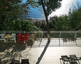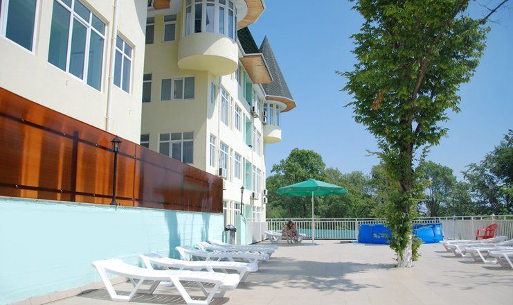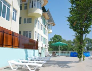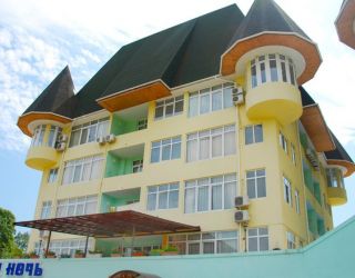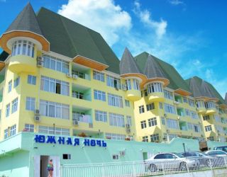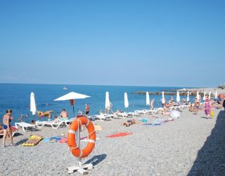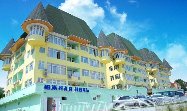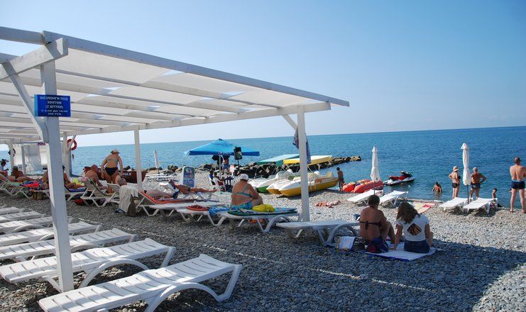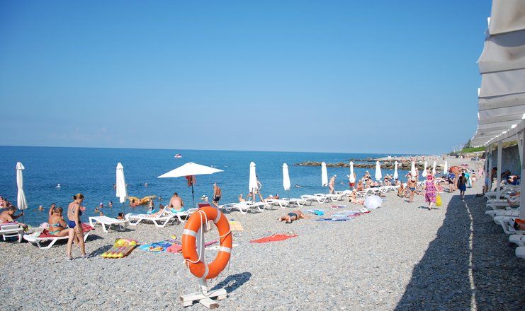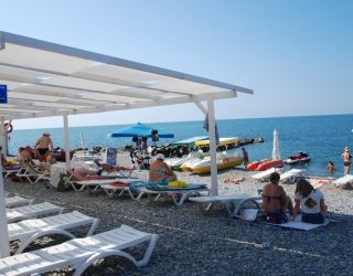 Пансионат «Южная ночь» расположена в стороне от автотрасс, чтобы шум машин не беспокоил отдыхающих. А вот городской мелкогалечный пляж – близко, в 100 метрах. Он оборудован зонтами и шезлонгами.Описание пляжа