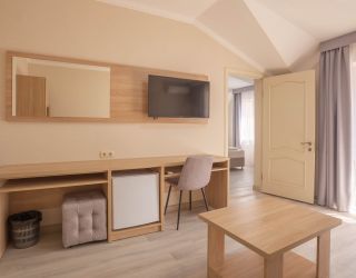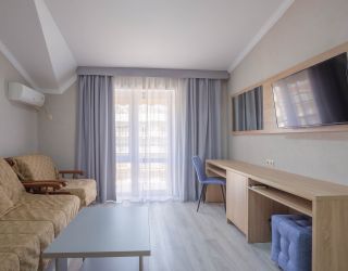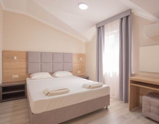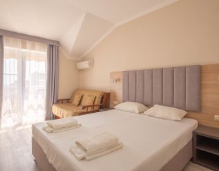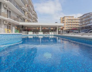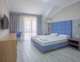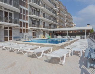 Шестиэтажный корпус отеля, оснащенный лифтом, возвышается на первой береговой линии всего в 700 метрах от моря. Отель находится на закрытой, оснащенной видеокамерами территории, поэтому отдыхающие могут не волноваться за безопасность. В распоряжении гостей двух- и трехместные номера со светлыми современными интерьерами. Все номера с удобствами, в каждом установлена сплит-система, есть телевизор, мини-холодильник, набор посуды.