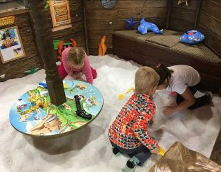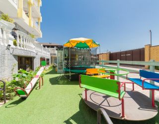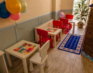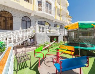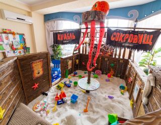 Бесплатно для детей проживающих в отеле установлен 2-х ярусный детский лабиринт, игровой комплекс для малышей, а так же игровой квест «Корабль сокровищ» с морской солью на дне, установленный в детской игровой комнате, где дети играют, ищут сокровища, монетки, обменивают их на пиратские деньги и получают призы.