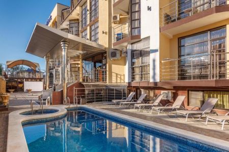 Поездом до ж/д вокзала г. Анапы, далее на маршрутном такси №120 до остановки «Паралия», далее 256 м до отеля.