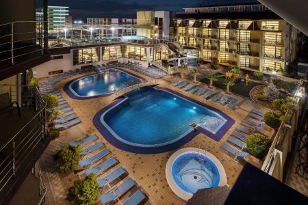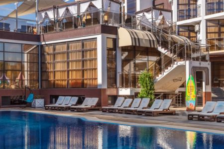 Самолетом до аэропорта г. Анапы, далее на рейсовом автобусе №127 до остановки «Аквапарк», далее на маршрутном такси №128 до остановки «Паралия», далее 256 м до отеля.