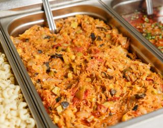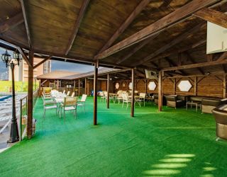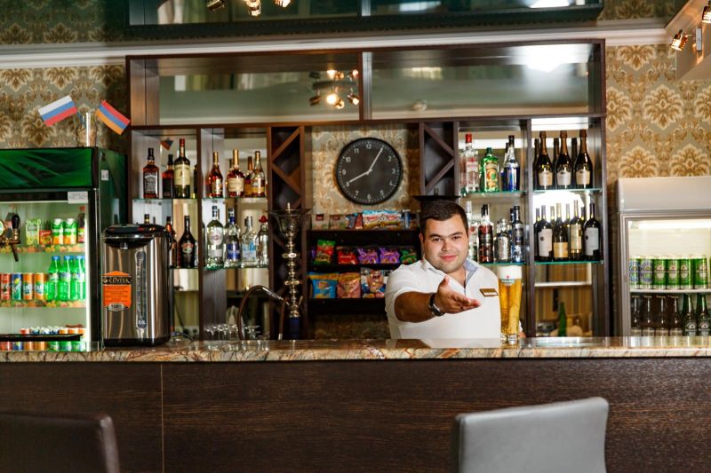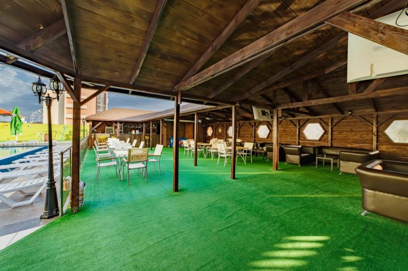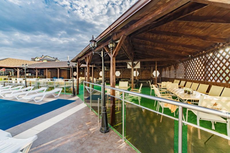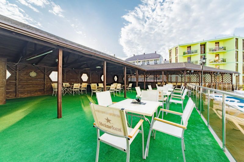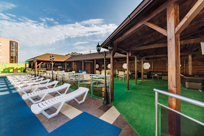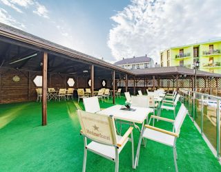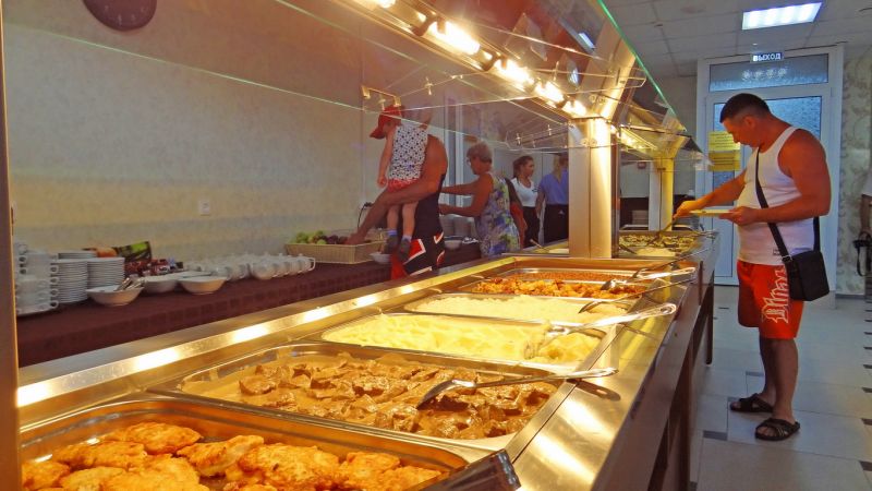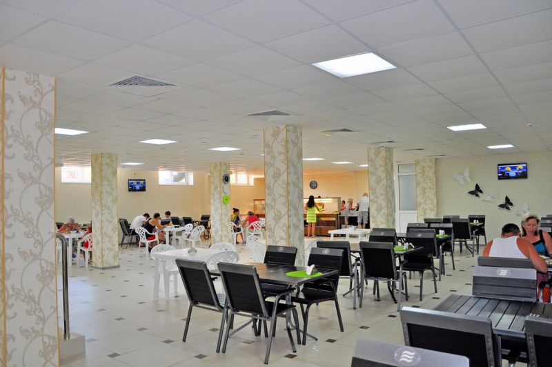 На территории отеля питание организовано по системе шведский стол. В меню богатый выбор мясных, рыбных блюд, первых блюд и бульонов, гарниров. Всегда свежие овощи, фрукты, зелень. Алкогольные напитки кубанских производителей- вино двух видов, пиво четырех видов, а также безалкогольные напитки – сок, компот, прохладительные чаи. Для самых маленьких предусмотрено детское меню и детские стульчики для кормления.