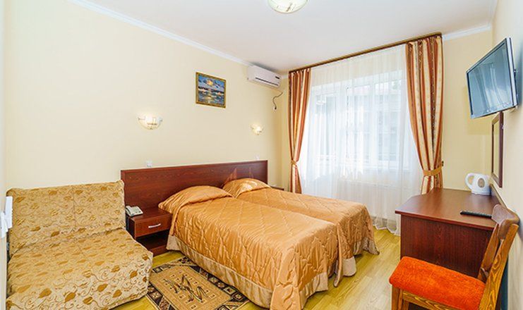 Санаторий занимает охраняемую территорию площадью чуть больше 2 гектаров. Территория благоустроена – много зеленых насаждений, цветников, есть декоративный мини-пруд с рыбками, беседки и уютные зоны отдыха. Жилой фонд санатория расположен в 8 зданиях разной этажности – от 4-х до 2-х этажей. Кроме жилых корпусов на территории здравницы есть лечебный корпус и здания столовой. В распоряжении гостей комфортабельные номера со светлыми интерьерами. Везде предусмотрен индивидуальный санузел, есть плазменный телевизор и фен.