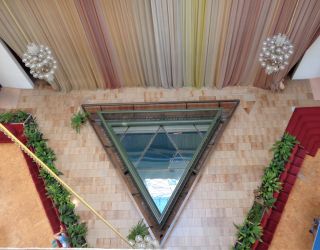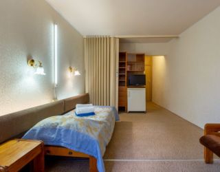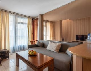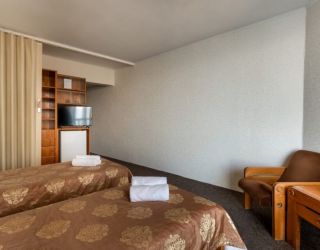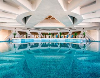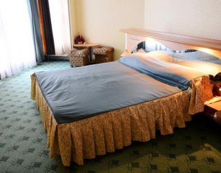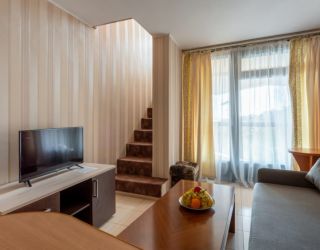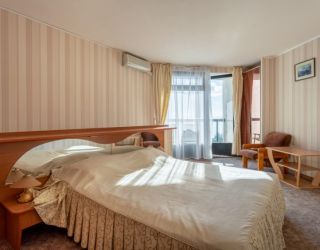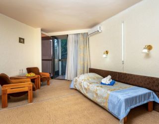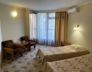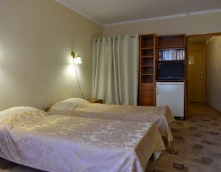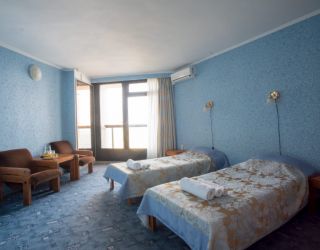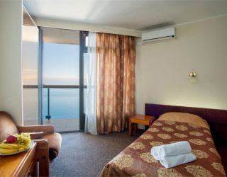 Номеров хватит на 500 гостей. Можно выбрать вариант размещения с видом на море или парк и северный склон стены-опоры. Есть номера всех категорий: эконом, стандарт и люкс. Везде предусмотрен обязательный набор удобств: балконы и совмещенные санузлы с ванной либо душем, а из оборудования – кондиционер, холодильник и телевизор.