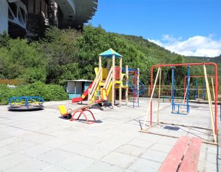 Здание санатория «Курпаты» в Крыму опирается на три башни. Главный корпус с основной инфраструктурой оборудован лифтом, доставляющим отдыхающих прямо на пляж- мелко-галечный, благоустроенный.
