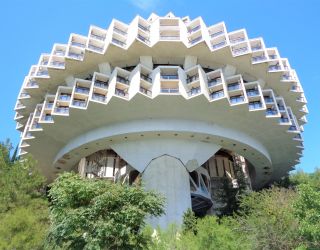 Название санатория «Курпаты» указывает на место его расположения: это одноименный курортный поселок под Ялтой в 8 км от центра города. Сразу после строительства необычного круглого корпуса местные жители прозвали новый архитектурный объект «летающей тарелкой». Такое здание не могло затеряться среди других здравниц. Оно стало достойным ответом современных зодчих на вызов талантливых предшественников, построивших по соседству «Ласточкино гнездо», Ливадийский и Воронцовский дворцы, главные крымские достопримечательности.