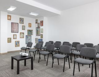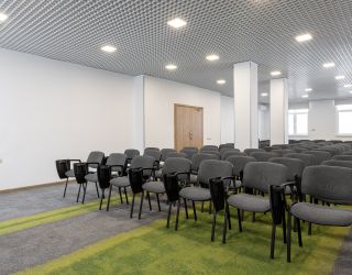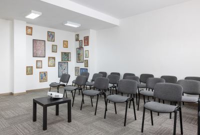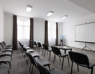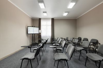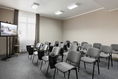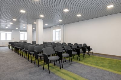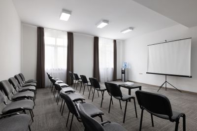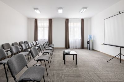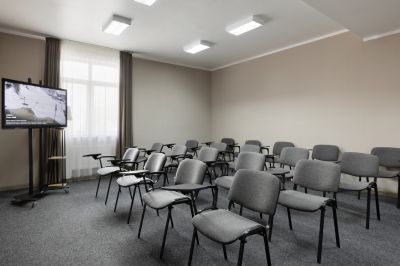 - предоставление необходимого оборудования (экран, проектор, флипчарт, кулер с водой, звуковое оборудование, конференц-стулья с откидными планшетами)