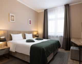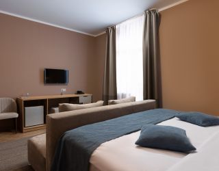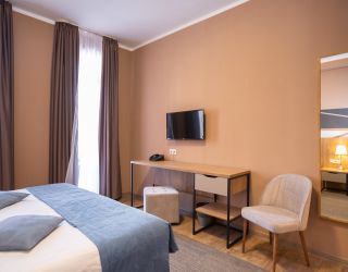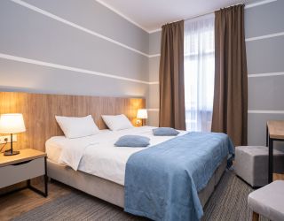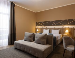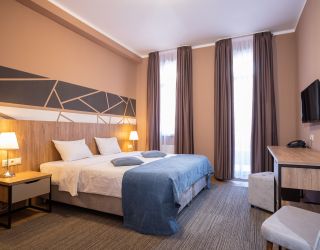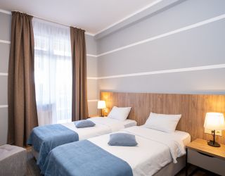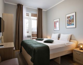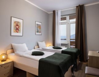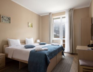Шестиэтажное здание отеля, занимающее закрытую охраняемую территорию, окружено живописными склонами Кавказских гор. Гостей ожидают 114 номеров разных по уровню комфорта. Номерной фонд включает в себя как стандартные одноместные и двухместные комнаты, так и просторных трехместные и четырехместные номера, подходящие для семейного отдыха.