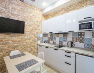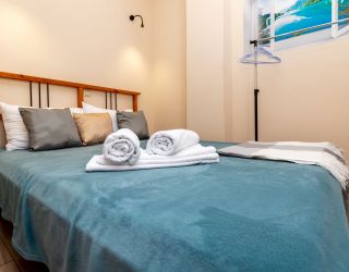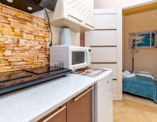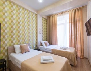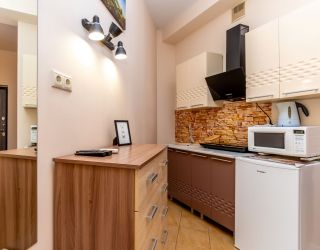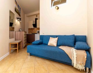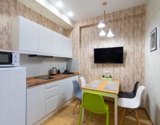 Апартаменты расположились в 5-этажном здании. Интерьер комнат выполнен в светлых оттенках, установлена удобная мебель для сна, шкаф для хранения одежды. В гостиной есть диван для отдыха, телевизор с плоским экраном. Санузел с душем, полотенцами, туалетными принадлежностями и феном. К услугам гостей стиральная машина, кондиционер. На кухне для самостоятельного приготовления еды предусмотрена необходимая бытовая техника и набор посуды. Личный транспорт можно оставить на парковке возле здания.