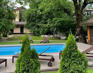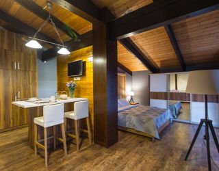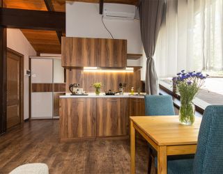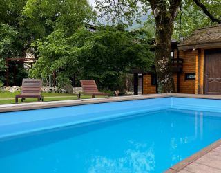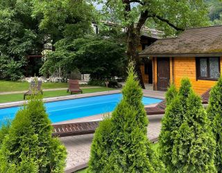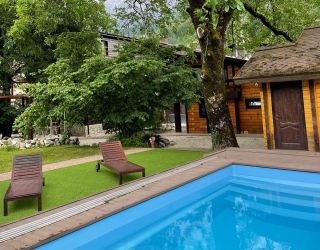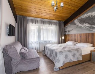 Трехэтажный гостевой дом-шале занимает благоустроенную живописную территорию, с которой открываются красивые виды на горы. Небольшой жилой фонд, рассчитанный на 50 человек, предлагает отдыхающим номера разных категорий, в том числе номера с кухней. Каждый номер оснащен индивидуальным санузлом, кондиционером, везде есть телевизор с плоским экраном, а в ванных комнатах — фен и наборы туалетных принадлежностей для гостей.