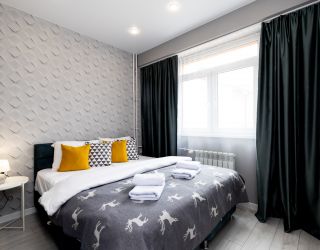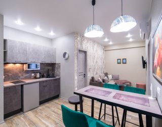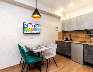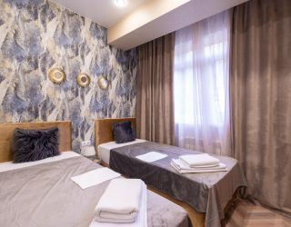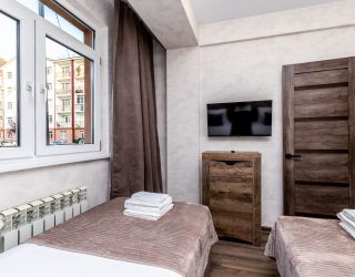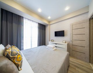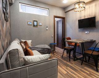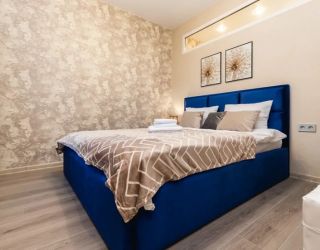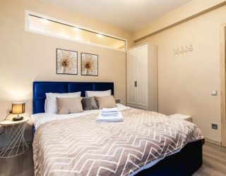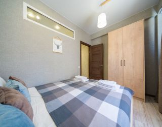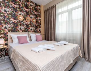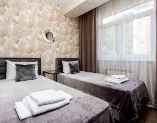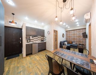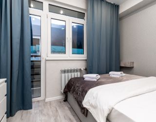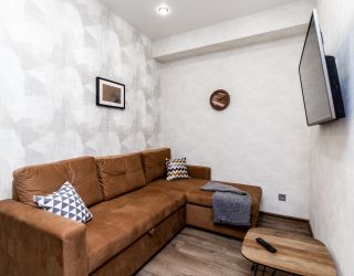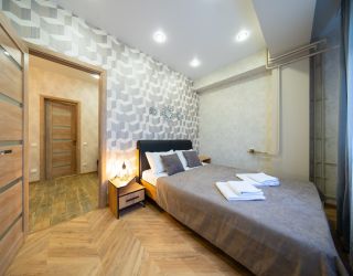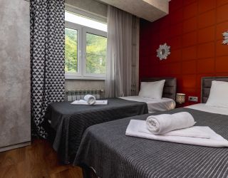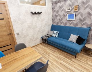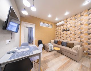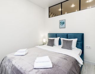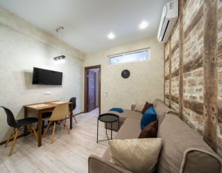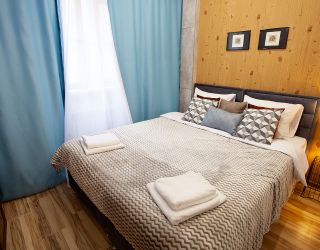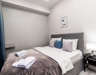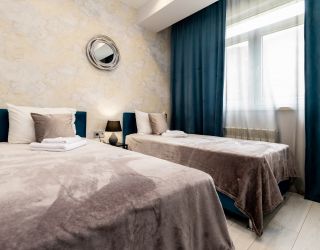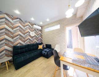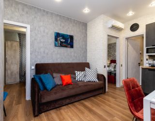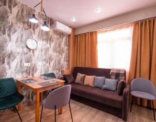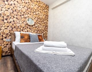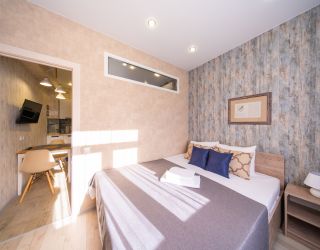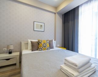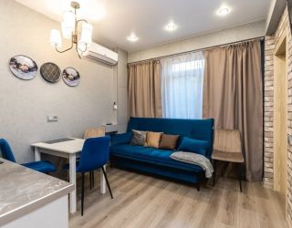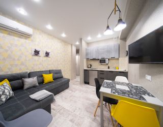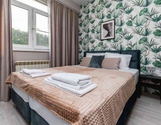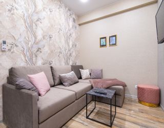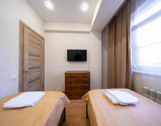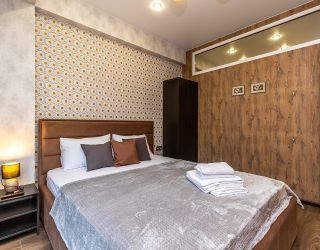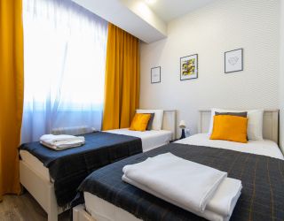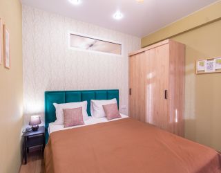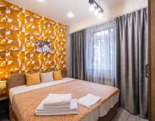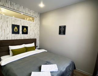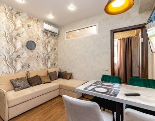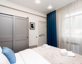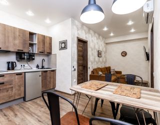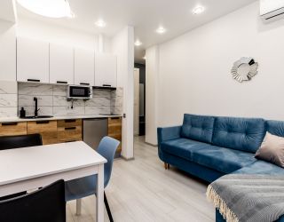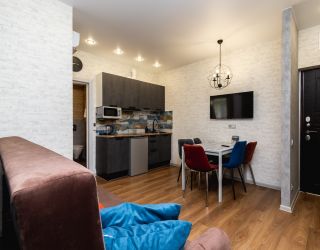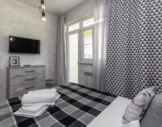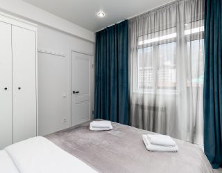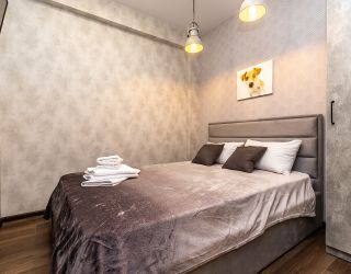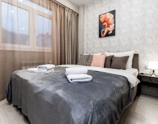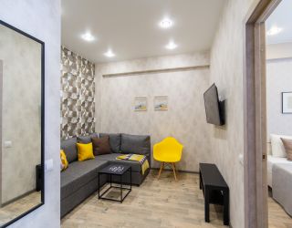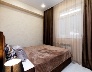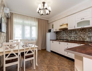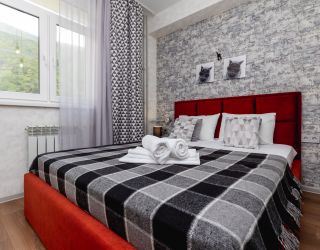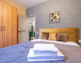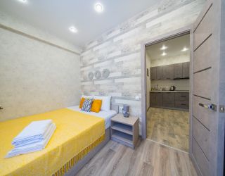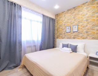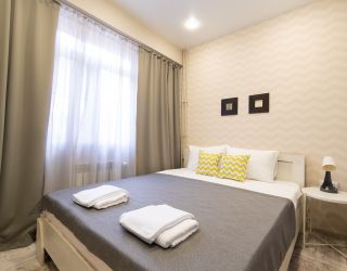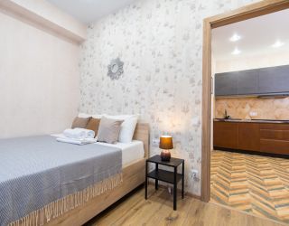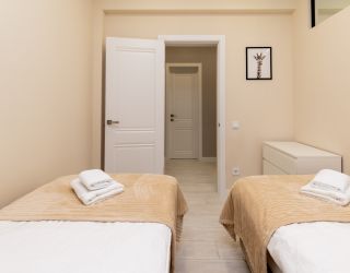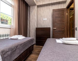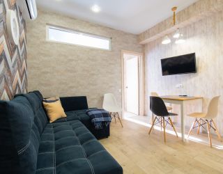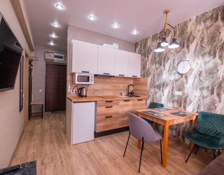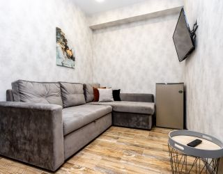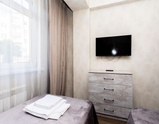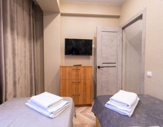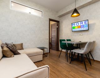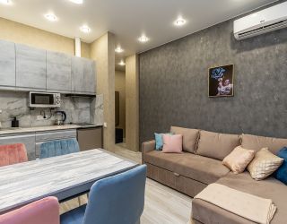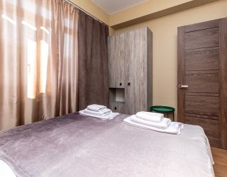 Апартаменты расположились в 6-этажном здании. Интерьер комнат выполнен в светлых оттенках, установлена удобная мебель для сна, шкаф для хранения одежды. В гостиной есть диван для отдыха, телевизор с плоским экраном. Санузел с душем, полотенцами, туалетными принадлежностями и феном. К услугам гостей стиральная машина, кондиционер. На кухне для самостоятельного приготовления еды предусмотрена необходимая бытовая техника и набор посуды. Личный транспорт можно оставить на парковке возле здания.