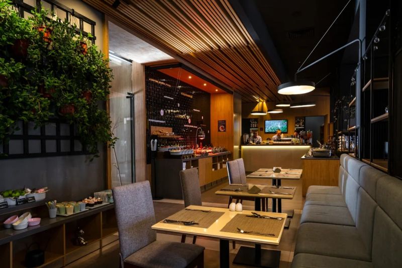 Завтраки подаются по системе «шведский стол», обеды и ужины по меню из блюд европейской и кавказской кухни. Дополнительные сервисы представлены фитнес-центром с тренажерным залом, саунами в мужской и женской раздевалке, а также несколькими конференц-залами.