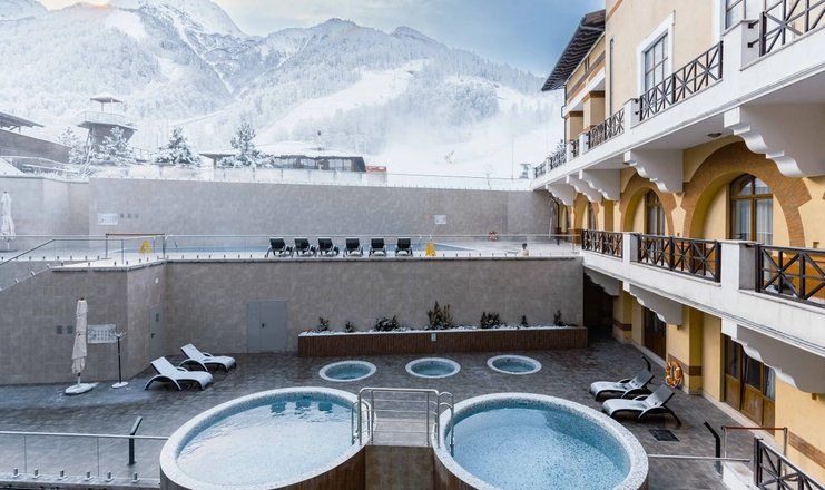 Зона отдыха SPA Novotel с открытым подогреваемым бассейном и видом на горы располагается на трех уровнях: четвертый, пятый и шестой во внутреннем дворе отеля под открытым небом. На уровне четвертого этажа - зона отдыха с шезлонгами и мягкой мебелью, а на уровне пятого этажа - 2 больших купели и 3 подогреваемых джакузи, в летнее время планируется работа бара. На самом верхнем уровне 6 этажа отеля - переливной подогреваемый бассейн 17 метров и раздевалки с саунами. Посещение бассейна доступно бесплатно для всех проживающих в отеле гостей.
