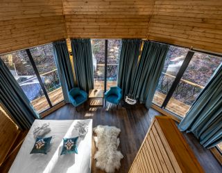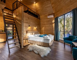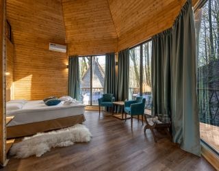 На территории в 2 гектара разместились 25 современных коттеджей, оборудованных панорамными окнами с потрясающим видом на природный ландшафт. Каждый коттедж-вигвам, построенный из деревянного бруса, предлагает комфортабельное размещение и все необходимые удобства в номерах. К услугам гостей кондиционер, сейф, кофемашина, электрический чайник, высокоскоростной интернет, мини-бар. Современный санузел оснащен необходимой сантехника, предоставляются туалетные принадлежности, мягкие полотенца.
