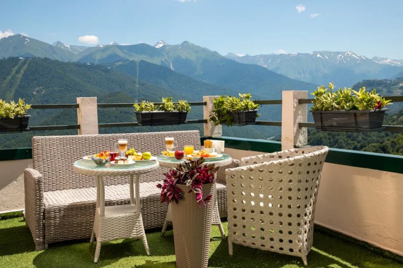 К услугам гостей — открытая терраса, площадью 200 м2 с собственным песочным пляжем и комфортабельными шезлонгами, для принятия солнечных ванн. С террасы открывается великолепная панорама горных вершин, где в вечернее время можно насладиться потрясающими закатами. Площадка также подходит для свадебных регистраций, фуршетов, дней рождений, деловых мероприятий, кулинарных мастер-классов и фотосетов.
