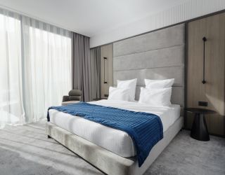 Отельный комплекс включает в себя 4 современных двухэтажных корпуса. К услугам гостей 42 уютных номера со стильными светлыми интерьерами. В каждом номере есть кондиционер, плазменный телевизор, электрочайник, большая двуспальная кровать, в комнатах установлены двери с повышенным классом звукоизоляции, а на балконах организованы зоны отдыха. В ванной комнате для гостей подготовлены халаты, тапочки и наборы косметических принадлежностей.
