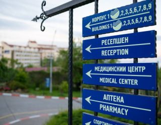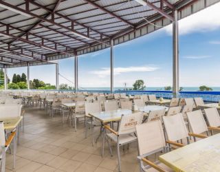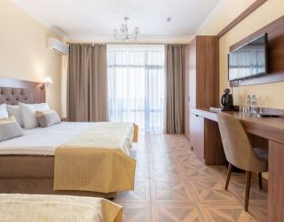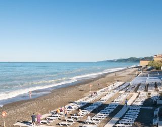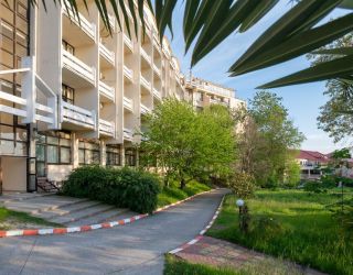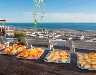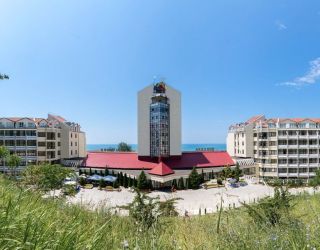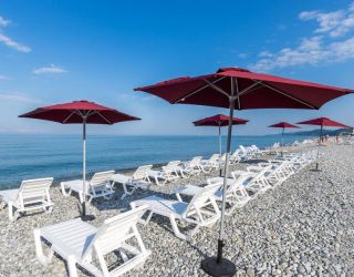 галечный оборудованный, в 150-300 м в зависимости от корпуса. На пляже: кафе, «vip» бар, итальянская пиццерия и барбекю, шезлонги, солнечные зонты, спасательный пост и медпункт, прокат спортинвентаря, открытый бассейн с морской водой