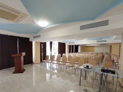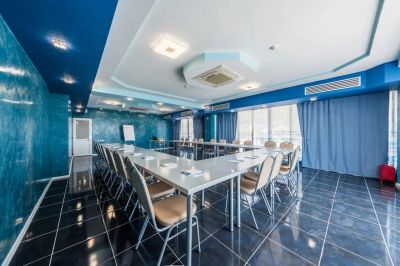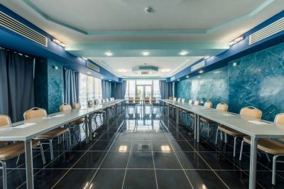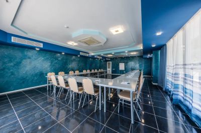 Благодаря обилию дневного света из огромных панорамных окон, выходящих в парк, нескольким входам, а также классическому дизайну просторный конференц-зал «Бирюзовый» является отличным местом для проведения деловых мероприятий до 130 человек. Рядом находится бар и ресторан, которые можно использовать в качестве дополнительных площадок для продолжения встречи и общения в неформальной обстановке.