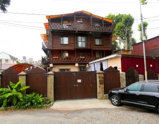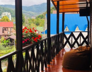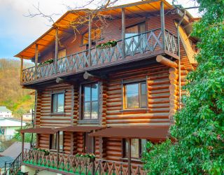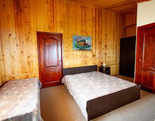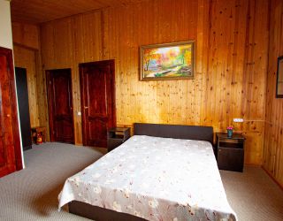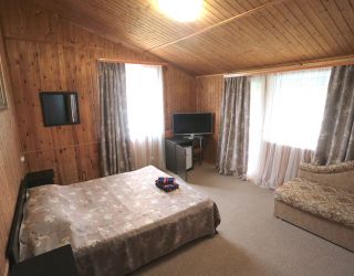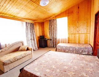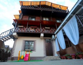 Корпус гостевого дома — четырехэтажный деревянный сруб, расположен на берегу горной реки. Отель выстроен из экологически чистых природных материалов, а потому в нем комфортно находится как жарким летом, так и в прохладную погоду.