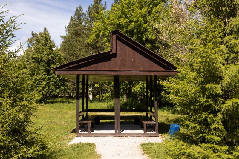 Беседка с мангалом, дрова, уголь, набор одноразовой посуды, скамейки