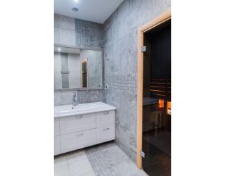 Также на первом этаже расположены туалет с беде и просторна ванная комната с душевой и дровяной сауной. Сауна сделана по финской технологии и дает приятный мягкий пар. Печь выполнена с использованием натурального карельского камня - талькохлорит. В качеств камней также использован талькохлорит. Есть эфирные масла. Любители бани оценят.
