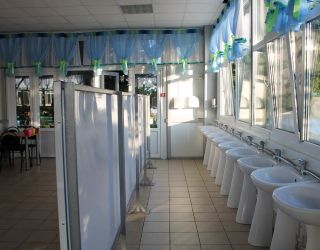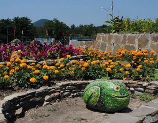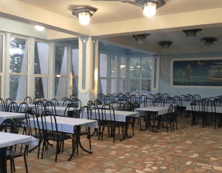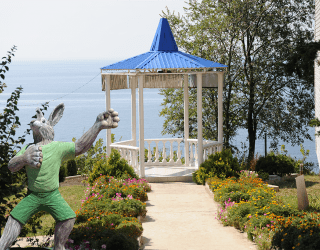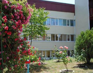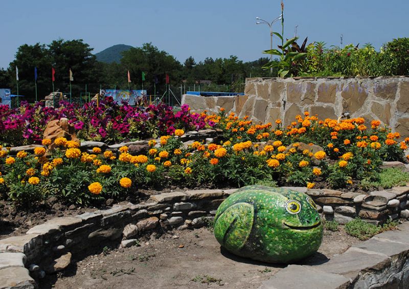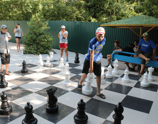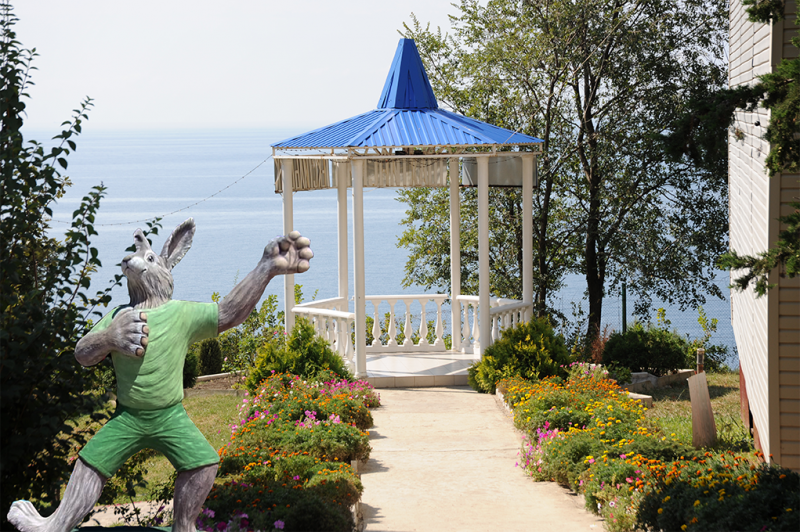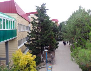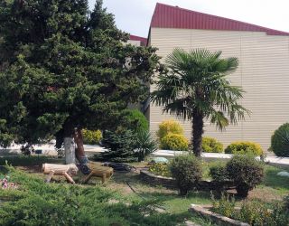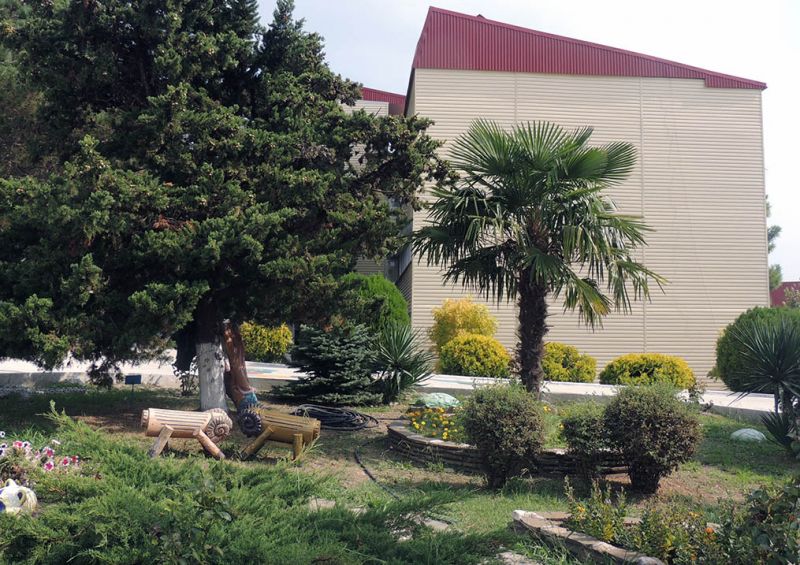 Территория пансионата прекрасно спланирована и ландшафтно-дизайнерски оформлена цветниками, кустарниками и множеством деревьев лиственных и хвойных пород, а также экзотических видов и сортов. На территории обустроены просторные тенистые отрядные места и беседки для отдыха, фонтаны, терренкуры и танцевальные площадки.
