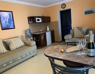 Рядом широкий песчано-галечный пляж. На побережье все оборудовано для комфортного отдыха: есть раздевалки, навесы, лежаки, работают кафе и бар, есть детская площадка, спасательный пост, а также много водных развлечений на любой вкус.