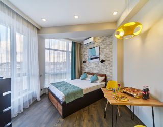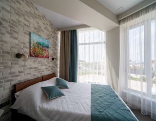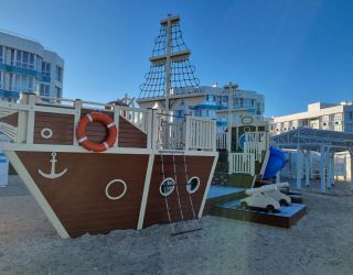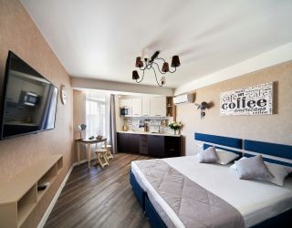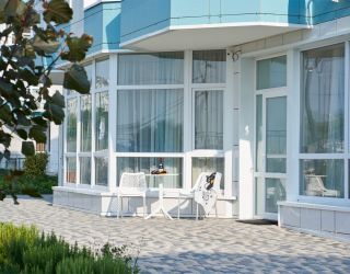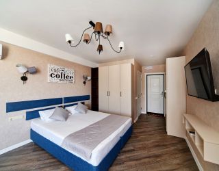 Четырехэтажный корпус отеля разместился на первой береговой линии курортного комплекса Адмиральская лагуна. Гостей ожидают комфортабельные Апартаменты, оформленные в различных стилях - кантри, морской, классический, шебби-шик, модерн. В каждом номере - ванная комната с душем и оборудованная мини-кухня, а из окон открывается вид на море.
